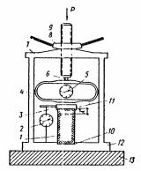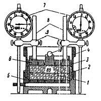Приборы должны обеспечивать возможность деформирования образца на величину, не меньшую 20 % его первоначальной высоты. Наиболее удобно использовать рычажные прессы с секторными рычагами на 0,5 и 1 т конструкции Гидропроекта. Из гидравлических прессов используются испытательные машины, оборудованные холодильным шкафом (например, испытательные машины ДМК-30 t).