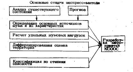 ЛенНИИПградостроительства разработан и практически опробован в комплексных схемах охраны среды городов /КСООС/ экспресс-метод, позволяющий оперативно оценить состояние шумового загрязнения, выделить наиболее важные объекты шумозащиты и предложить стратегический план мероприятий с учетом ожидаемого экономического эффекта. Это новый этап в проектировании, так как вопросы шумозащиты решаются в общем русле комплексной оценки для выбора стратегии на ближайшие годы и перспективу.