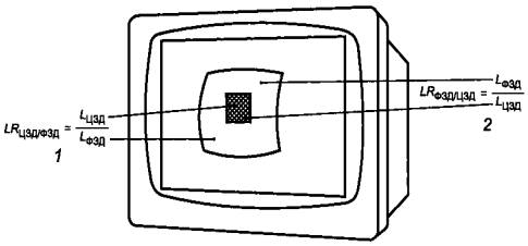 LЦ, LФ - усредненные по площади яркости, излучаемые группой пикселей. Излучаемые яркости измеряют при наибольшем и наименьшем значениях уровня яркости дисплея, используемой для отображения текста и сюжета при программном управлении;