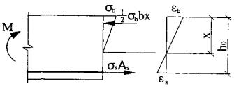 При этом напряжения в вершине сжатой зоны бетона меньше или равны расчетным сопротивлениям бетона сжатию Rb, а напряжения в растянутой продольной арматуре равны расчетным сопротивлениям растяжению.
