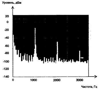 6.4.3 При коэффициенте нелинейности в канале связи более 2-3% на мониторе ПЭВМ хорошо просматриваются вторая и третья гармоники от измерительной частоты 1020 Гц, соответственно, на частотах 2040 и 3060 Гц, согласно рисунка 10.