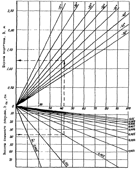 При таких данных η0 = 4600, что свидетельствует о чрезвычайной суровой наледной обстановке в выемке, замерзании всей разгружающейся воды на месте, перекрытии наледью всей зоны разгрузки, образовании наледи объемом около 105 м3. Для успешной борьбы с такой наледью требуются только постоянные сооружения, исключающие действия основных наледеформирующих факторов.