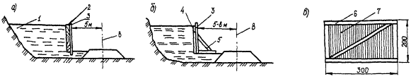 2.12. Ограждающие устройства предназначены для исключения влияния наледи (при допущении ее образования) на устойчивость и эксплуатационную надежность земляного полотна, водопропускных сооружений и других объектов и включают: деревянные щиты, шандоры, шторки, устанавливаемые на входных оголовках водопропускных труб, бермы из скального или другого фильтрующего грунта. Перечисленные устройства исключают отложение наледного льда в отверстии водопропускных труб в случае формирования небольших наледей на периодических водотоках. Бермы из скального или другого фильтрующего грунта применяются для защиты откосов насыпей, конусов мостов на наледных участках.