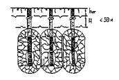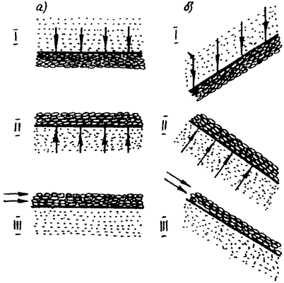 2.27. Фильтрующие обсыпки дренажных труб могут иметь трапецеидальную, ромбическую и другие более сложные формы (рис. 2.3, а, б, в). В случае слоистого строения дренируемого водоносного пласта второму слою фильтрующей обсыпки придают одну или две шторы, преграждающие движение грунтового потока над трубчатым дренажем и транспортирующие дренажную воду в последний (см. рис. 2.3, в).
