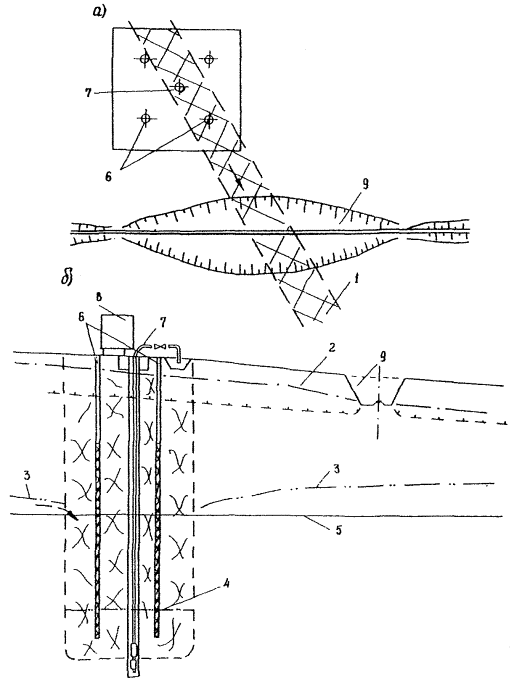 в местах стеснения водоносных слоев фундаментами сооружений, а также высокими насыпями, возводимыми из глинистых грунтов;
