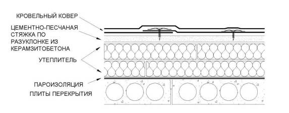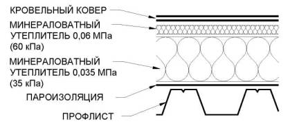 На пароизоляцию укладывается минераловатный утеплитель с прочностью на сжатие при 10% деформации не менее 0,035 МПа (35 кПа). Верхняя более жесткая плита, с прочностью на сжатие при 10% деформации не менее 0,06 МПа. Укладка кровельного ковра из битумно-полимерных материалов производится непосредственно на верхнюю минераловатную плиту.