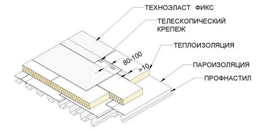 Телескопический крепеж - состоит из пластикового стакана и стального самореза диаметром 4,8 мм. Применяется при креплении кровельного ковра к несущему основанию из оцинкованного профлиста, если в качестве утеплителя используются минераловатные плиты. Может использоваться при уклонах несущего основания не более 10%. Длина самореза и пластикового стакана выбирается по спецификациям производителя. После монтажа саморез должен выходить из профлиста на 15-25 мм внутрь помещения.