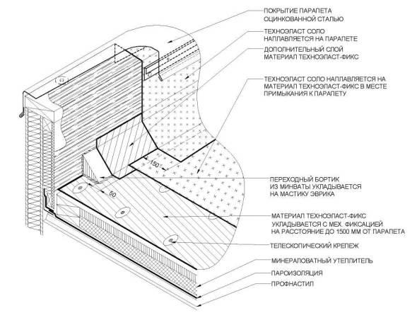 По периметру примыкания к парапету укладывают материал Техноэласт-фикс на расстояние до 1,5 м от парапета, фиксируя его по всей поверхности полотна. Материал Техноэласт СОЛО на примыкании к парапету наплавляется на материал Техноэласт-Фикс.