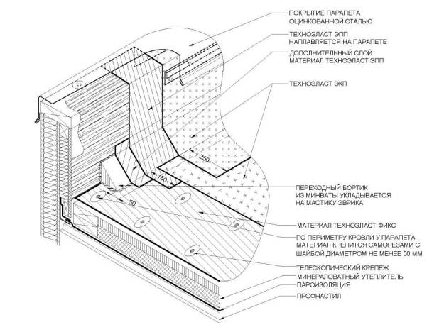 5.5. На вертикальных поверхностях нижний слой кровельного ковра также приклеивают по всей площади. В качестве материала нижнего слоя применяют Техноэласт ЭПП.