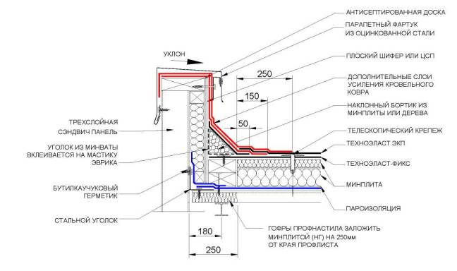 5.4. В местах сопряжения кровельного ковра с вертикальными поверхностями дополнительный слой усиления кровельного ковра приклеивается по всей поверхности. Для слоя усиления применяют материал Техноэласт ЭПП.