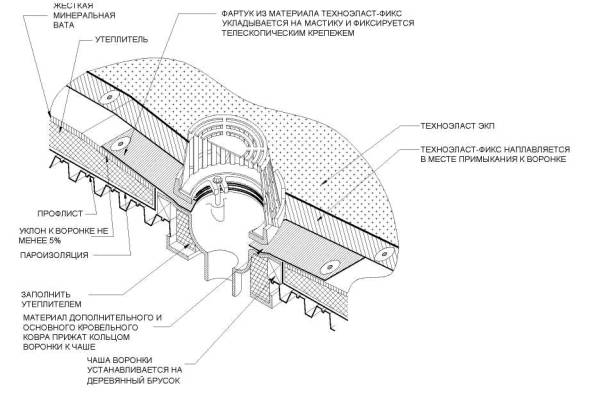 6.4. Узел воронки при устройстве двухслойной кровли с механическим креплением.