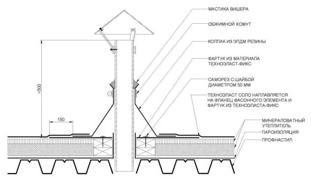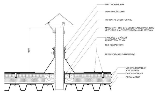 6.6. Узел прохода трубы через кровлю при устройстве двухслойной кровли с механическим креплением.
