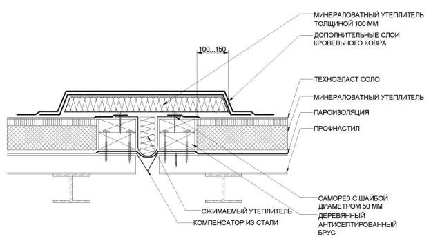 6.8. Узел устройства деформационного шва при устройстве двухслойной кровли с механической фиксацией.