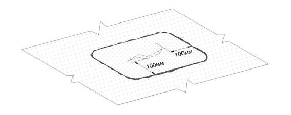 Заплата должна иметь закругленные края и перекрывать поврежденную поверхность не менее чем на 100 мм во всех направлениях.