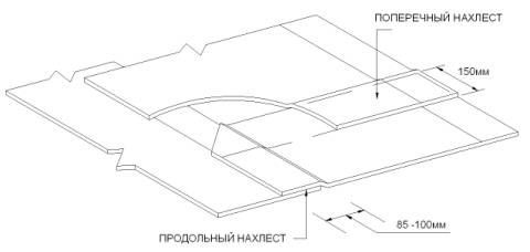 5.9.6. Рулонный материал следует укладывать с нахлестом полотен в поперечных стыках не менее 150 мм и в продольных 85 - 100 мм (Рис. 9).