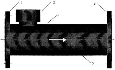 1 - присоединительный фланец для подключения линии подачи рабочего раствора пенообразователя; 2 - корпус; 3 - присоединительный фланец для подключения линии отвода пены; 4 - воздухозаборное отверстие; 5 - стрелка, указывающая направление потока огнетушащего вещества (пены)
