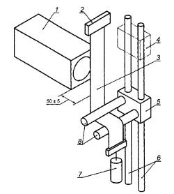 1 - датчик для измерения напряженности поля; 2 - фиксированный зажим; 3 - образец для испытаний; 4 - ползун в исходном положении; 5 - ползун в конечном положении; б - направляющие; 7 - натяжное приспособление (зажим с грузом); 8 - цилиндрические стержни