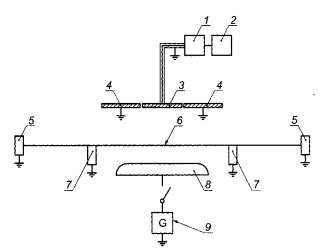 1 - усилитель заряда; 2 - регистрирующий прибор; 3 - датчик для измерения поля: 4 – защитное кольцо; 5 - зажимное кольцо для образца; 6 - образец для испытаний; 7 - опорное кольцо 8 - электрод для создания поля; 9 - генератор напряжения