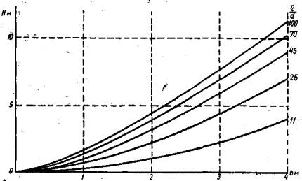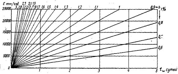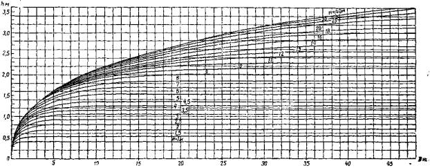Для выбранного пункта берега используются данные лишь наветренных румбов. Для этих ветров, по указаниям раздела II технических условий, определяются высоты возможных волн 1 % обеспеченности и, пользуясь графиками, тип которых изображен на рис. 6, по высоте этих волн и продолжительности действия ветров tw находят энергию данного волнения в тоннометрах.