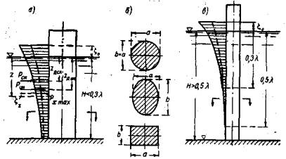 в) воздействия на отдельно стоящие опоры и сквозные конструкций неразбитой, разбитой и прибойной волны и прибойного потока;