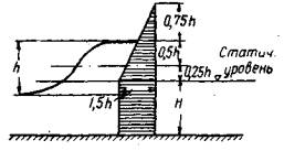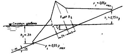 Находят верхний и нижний расчетные уровни воды: по графику повторяемости - примерно 2 - 4%, по графику обеспеченности - примерно 6 и 96%. К верхнему уровню прибавляют одну треть высоты «рабочей волны», производящей в данном месте максимум размывающей работы, и от нижнего уровня откладывают вниз одну высоту рабочей волны.