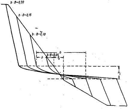 Переход от определенной расчетом величины ωi к соответствующему профилю отмели и к положению ее относительно первоначального берега производится по зависимостям ω = f1(b) и l = f2(b).