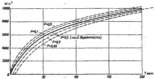 16. В результате случайных отклонений действительного Сочетания волнений от наиболее вероятного, определяемого расчетом (п. 14), могут возникать отклонения действительных объемов разрушений от наиболее вероятных. Величина возможного объема разрушения заданной обеспеченности Р на заданный срок прогнозирования Т определяется сроком ТР , в течение которого осуществляется наиболее вероятный размыв ωт.р, представленный на рис. 5 сплошной линией. Значения ТР, вычисленные на основе теории вероятности, приведены в табл. 3.