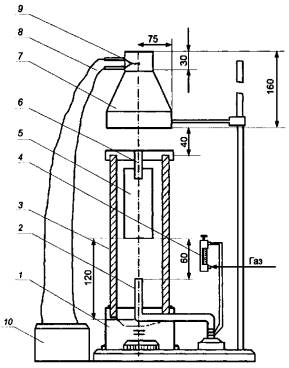 1 - подставка; 2 - газовая горелка; 3 - керамический короб; 4 - ротаметр; 5 - образец; 6 - держатель образца; 7 - зонт; 8 - термоэлектрический преобразователь; 9 - верхний патрубок зонта; 10 - автоматический потенциометр