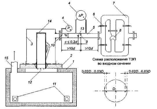 1 - печь; 2 - фрагмент плиты перекрытия с узлом опоры и испытываемым образцом; 3 - коллектор; 4 - микроманометр; 5 - мерный участок; 6 - регулирующая заслонка; 7 - воздуховоды обвязки вентилятора; 8 - вентилятор; 9 - расходомерная диафрагма; 10 - точка отбора давления в полости испытываемого образца; 11 - форсунки; 12 - ТЭП, установленные во входном сечении образца; 13 - ТЭП, установленный в сечении установки расходомерного устройства; 14 - заглушённый торец образца; 15 – дымоход