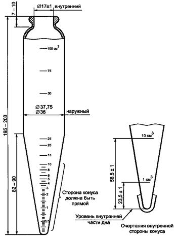 Пробирка, применяемая в центрифуге, должна иметь коническую форму, номинальную высоту 200 мм, но не более 203 мм, соответствовать размерам, приведенным на рисунке 1, и должна быть изготовлена из прокаленного стекла с прямыми сторонами конуса. Градуировка и цифры, показанные на рисунке 1, должны быть ясными и отчетливыми, и горловина должна быть сужена для пробки. Допуски на ошибки шкалы и наименьшие деления между разными калибровочными отметками приведены в таблице 1. Калибровка выполнена при температуре 20°С с использованием воды, не содержащей воздух, снятие показаний проводилось по нижнему затемненному мениску. Перед использованием пробирки точность градуировок должна быть поверена по объему на пробирке в соответствии с ИСО 4787.