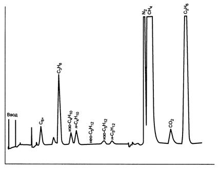 Измеряют площадь пика пропана, вышедшего из колонки 2 (через колонку 1), и площадь пика этана, вышедшего из колонки 3 (также через колонку 1).