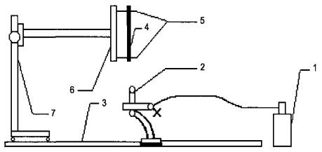 1 - кронштейн; 2 - неподвижный стержень; 3 - образец рукава; 4 - линейка; 5 - подвижный стержень; 6 - груз