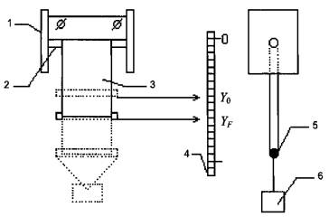 7.10.3 В образец 3 вставляют неподвижный стержень 2 диаметром (20,0 ± 0,5) мм и закрепляют его в кронштейне 1; затем вставляют в образец подвижный стержень 5 того же диаметра массой (0,10 ± 0,01) кг и проводят предварительное растяжение образца грузом 6 массой (1,00 ± 0,05) кг в течение 60 с. Через (60 ± 5) с после снятия предварительной нагрузки отмечают на линейке 4 положение нижнего стержня у0.