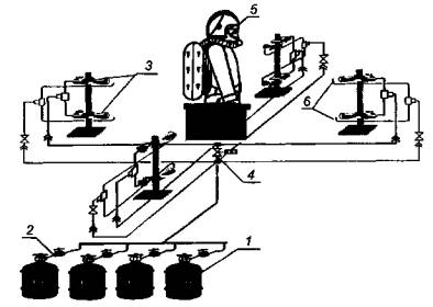 1 - баллоны газовые; 2 - редуктор; 3 - горелки газовые; 4 - клапан электромагнитный; 5 - манекен с аппаратом дыхательным; 6 - система поджига