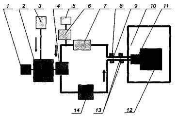 1 - привод насоса «искусственные легкие»; 2 - насос «искусственные легкие»; 3 - дозатор диоксида углерода; 4 - клапанная коробка с клапанами вдоха и выдоха; 5 - газоанализаторы диоксида углерода и кислорода; 6 - насос для отбора проб; 7 - холодильник; 8 - датчики температуры и влажности; 9- прибор для измерения температуры ГДС; 10 - климатическая камера; 11 - муляж головы человека (голова «Шеффилда»); 12 - аппарат; 13 - датчики сопротивления дыханию; 14 - термостат с увлажнителем