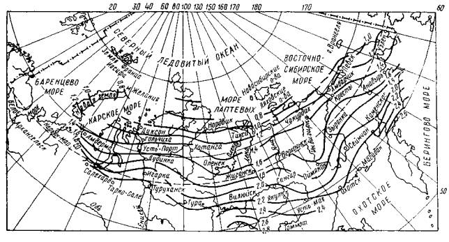 Изолинии глубин сезонного оттаивания глинистых грунтов