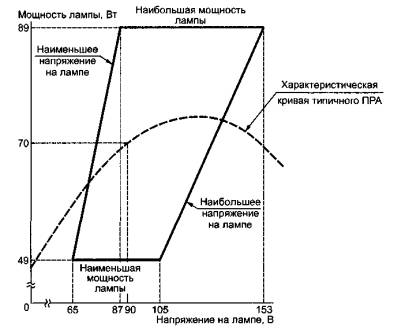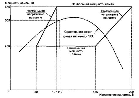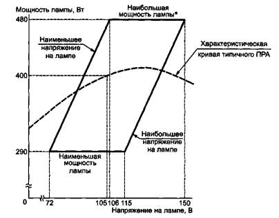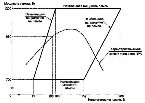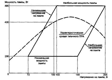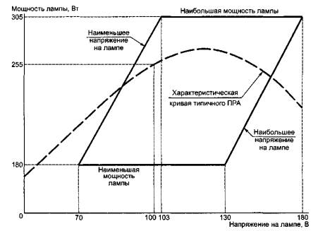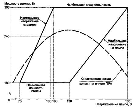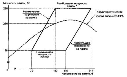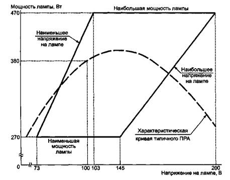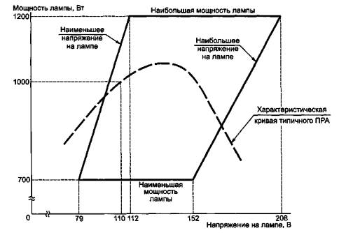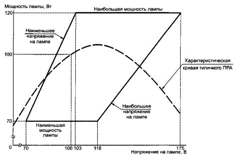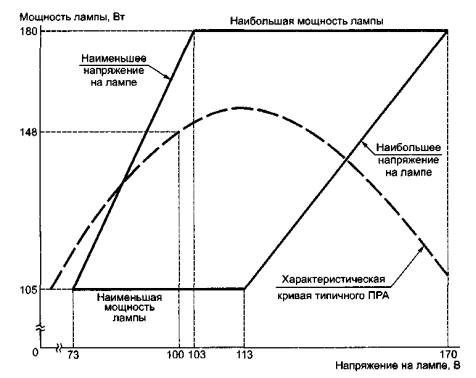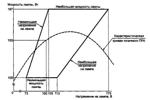 Характеристические кривые типичных ПРА при расчетном напряжении источника питания показаны на диаграммах пунктирной линией.