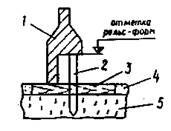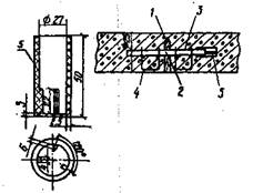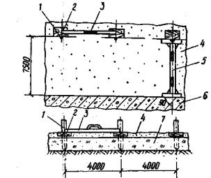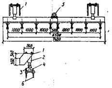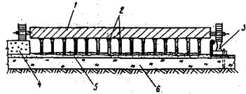 1 - двутавровая балка; 2 - штыри диаметром 20 мм (через 20 - 30 см); 3 - рельс-форма; 4 - цементобетонное покрытие соседнего ряда; 5 - битумно-песчаный выравнивающий слой; 5 - основание из грунта, укрепленного цементом