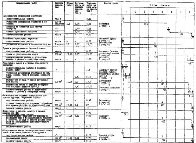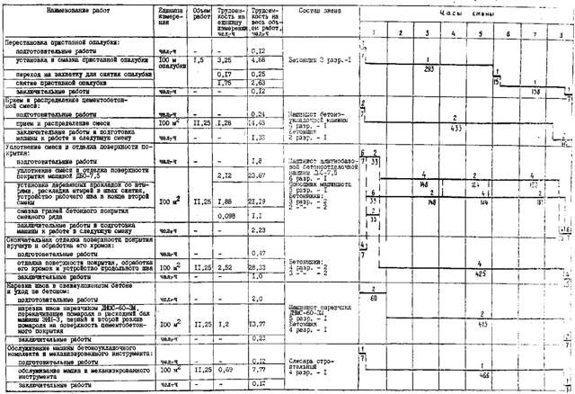 В настоящих технологических картах предусмотрены: сменная производительность на устройстве цементобетонного и железобетонного покрытия - 150 м (работы выполняются на 7 захватках); уплотнение и отделка поверхности бетонного покрытия длиннобазовой бетоноотделочной машиной ДБО-7,5; уход за бетоном нанесением пленкообразующих материалов; нарезка контрольных швов в свежеуложенном бетоне через 21 м нарезчиком ДНШС-60-3М, с последующей нарезкой остальных швов нарезчиками ДС-112 и ДС-115 с алмазными дисками; устройство швов расширения через 56 м; заполнение пазов швов битумными мастиками с использованием заливщика ДС-67.