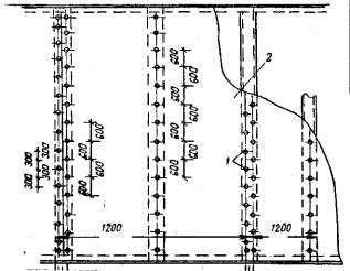 Рис. 14. Крепление гипсокартонных облегченных листов к стойкам: 1 - шурупы; 2 - листы