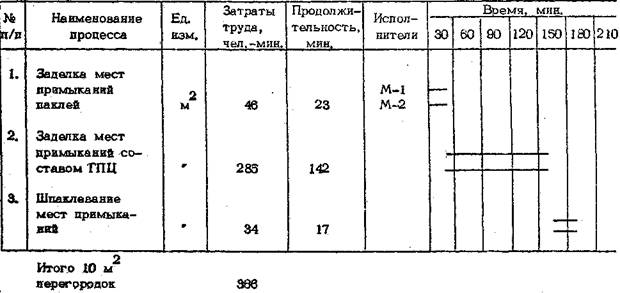 Подготовку перегородок под оклейку обоями или окраску выполняет бригада маляров, состоящая из 8 человек (4 звена по 2 чел, в каждом), которая не входит в состав бригады монтажников. Электропроводку выполняет электрик-монтажник.