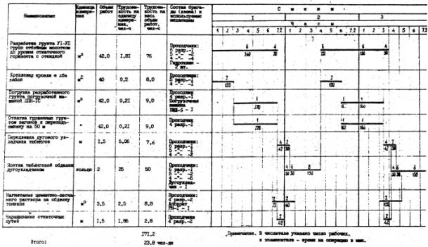 2.3.1. График работ предусматривает следующие операции: подготовительные работы; разработку грунта буровзрывным способом; доработку грунта в лотке отбойным молотком; погрузку грунта породопогрузочной машиной ППМ-4М; установку временного крепления лба забоя; откатку груженых вагонеток из рабочей зоны и нормирование составов подкатку порожних вагонеток; передвижку тюбингоукладчиков, технологической тележки и ползушек; монтаж обделки тоннеля; нагнетание цементно-песчаной смеси за обделку тоннеля; укладку узкоколейного пути.