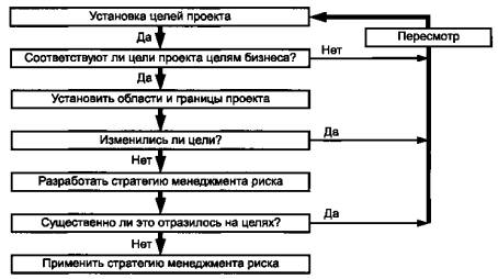 Прояснение целей проекта и первоначальных задач. Идентификация рисков, связанных с выполнением проекта с учетом установленных целей проекта. Проведение предварительного анализа рисков по целям и процессу проекта. Представление на уровень предприятия в режиме обратной связи информации по потенциальным идентифицированным рискам на уровне предприятия. Передача информации по рискам, имеющим отношение к среде выполнения проекта, для их рассмотрения лицами, ответственными за принятие решений на уровне предприятия |
