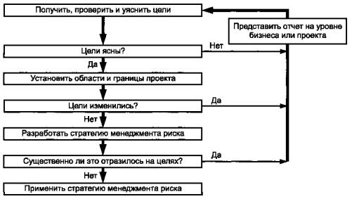 Прояснение целей проекта и первоначальных задач. Проведение предварительного анализа рисков. Передача информации по потенциально непрогнозируемым или новым идентифицированным рискам на уровень проекта. Установление процесса менеджмента рисков |