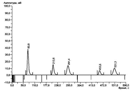 Время выхода компонентов: 83,8 с - пропилмеркаптан и высшие; 213,6 с - метилмеркаптан; 291,4 с - этилмеркаптан; 453,6 с - сероводород; 531,3 с - карбонилсульфид