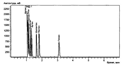 Время выхода компонентов: 1,05 мин - метан; 1,08 мин - этан; 1,14 мин - пропан; 1,24 мин - изобутан; 1,33 мин - бутан; 1,65 мин - изопентан; 1,82 мин - пентан; 3,10 мин - гексан.