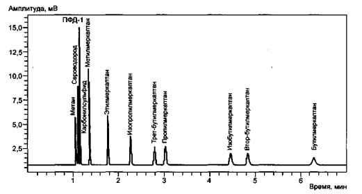 Время выхода компонентов: 1,11 мин - сероводород; 1,15 мин - карбонилсульфид; 1,37 мин - метилмер-каптан; 1,78 мин - этилмеркаптан; 2,27 мин - изопропилмеркаптан; 2,79 мин - трет-бутилмеркаптан; 3,02 мин - пропилмеркаптан; 4,46 мин - изобутилмеркаптан; 4,84 мин - втор-бутилмеркаптан; 6,30 - бутил-меркаптан