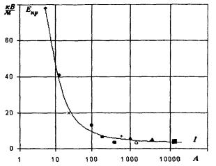 Вероятность h перехода перекрытия в силовую дугу, т.е. вероятность отключения линии, оценивается по средней рабочей напряженности Еср, кВ/м вдоль пути разряда Iразр: