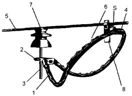 1 - провод; 2 - изоляция провода; 3 - изолятор; 4 - траверса; 5 - прокалывающий зажим; 6 - спираль (алюминиевый провод); 7 - "защитный рог"; 8 - грозовое перекрытие