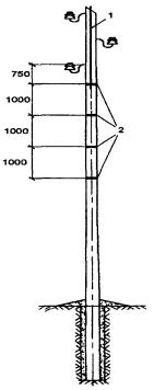 На особо поражаемых молнией участках трассы ВЛ 6-10 кВ рекомендуется отдельные деревянные стойки защищать от расщепления при ПУМ шунтированием верхней части стоек металлическим спуском и установкой бандажей из стальной проволоки на нижние части стоек по рисунок Ж.1. Указанная защита позволяет сохранить достаточную изоляцию на землю, чтобы предотвратить грозовые перекрытия при индуктированных перенапряжениях.